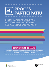 Divendres 11 de març tindrà lloc la presentació del procés sobre la instal·lació de càmeres lectores de matrícula als accessos del municipi. En aquest acte, que es farà a les 20.30 h a la Sala Nou Casino, s’hi explicaran els detalls del procés participatiu, la votació del qual s’engegarà el 21 de març i s’allargarà fins a l’1 d’abril, i s'informarà sobre qui podrà votar, com i quan, i quan se sabrà el resultat final.